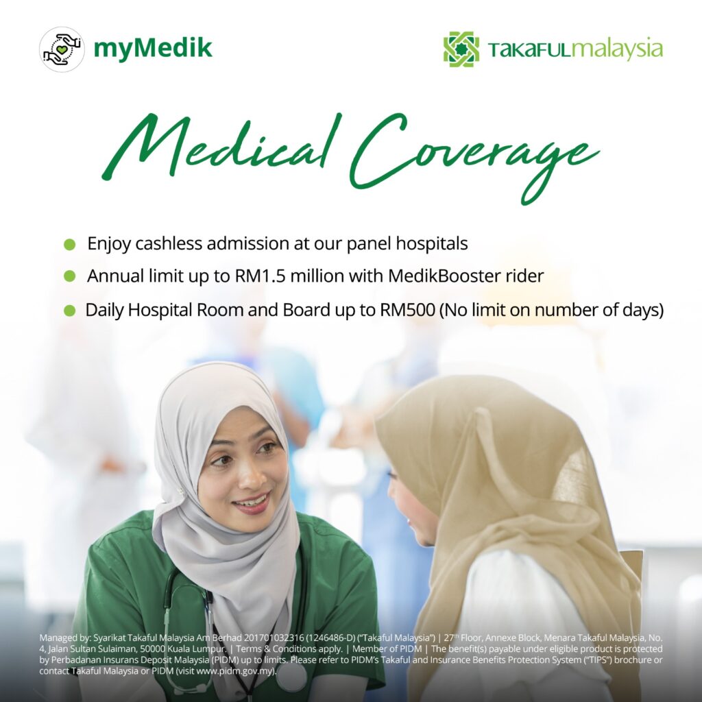 Stay protected with confidence! TM myMedik offers comprehensive medical coverage with annual limits up to RM1.5 million and cashless admission at panel hospitals. Enjoy daily hospital room and board up to RM500 and a wide range of benefits, including surgery, outpatient treatments, and more. Affordable, flexible, and designed with your health in mind.
